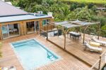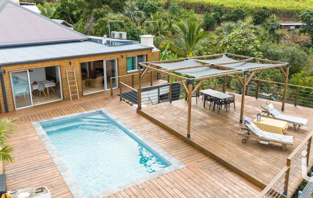La pièce maîtresse de cette propriété reste la piscine et la grande terrasse en bois de 120 m², offrant une vue panoramique à couper le souffle sur l’océan. Véritable invitation à la contemplation, elle se prête aussi bien aux moments de détente qu’aux soirées conviviales.