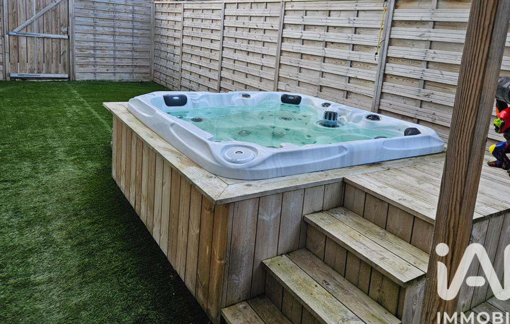 A l'étage : un palier dessert 2 belles chambres dont une avec dressing, une salle de bains et un wc. Côté extérieur, vous apprécierez la véranda et la grande terrasse en bois d'environ 80m² parfaite pour profiter des repas en extérieur et se détendre en toute quiétude dans le jacuzzi.