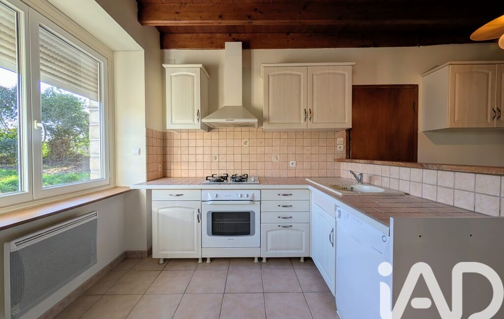 L’entrée dessert un salon lumineux équipé d’un poêle à bois, ainsi qu’une cuisine aménagée et équipée (four, plaque de cuisson gaz, hotte et lave-vaisselle).