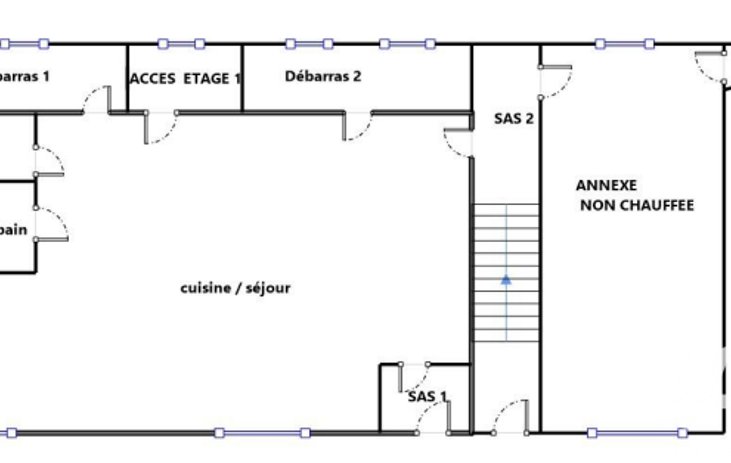 En rez-de-chaussée : un sas d’entrée, une pièce de vie avec coin cuisine, une salle d’eau, un WC, deux débarras, ainsi qu’une annexe communicante non chauffée,