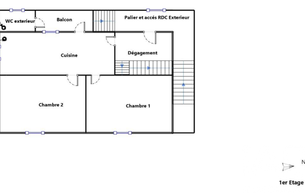 Au premier étage : une cuisine indépendante, deux chambres, un balcon et un WC,