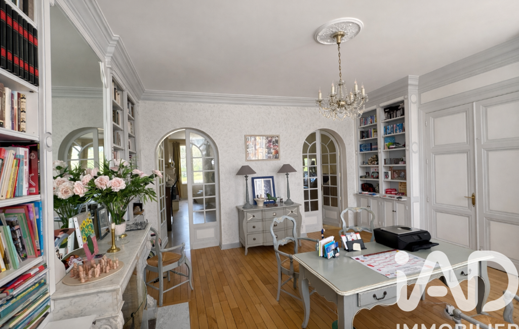 Dès l’entrée, un vaste vestibule traversant met en valeur les volumes et la distribution harmonieuse des espaces de réception. Le rez-de-chaussée propose un salon, une salle à manger lumineuse, un bureau bibliothèque, une cuisine équipée avec cellier / buanderie attenant, ainsi qu’une chambre avec salle d’eau.