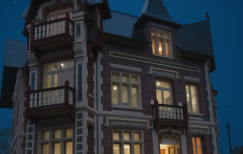 ✔ façade en brique avec alternance de briques rouges et blanches, signature des constructions bourgeoises, ornée de céramiques d'époque