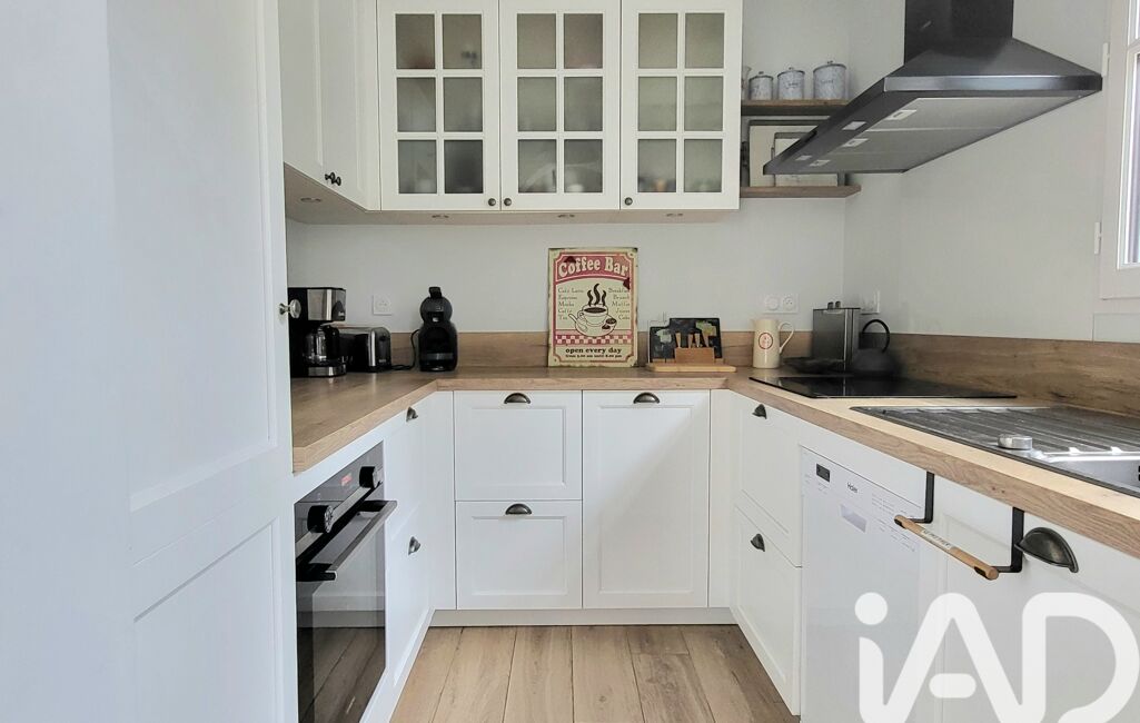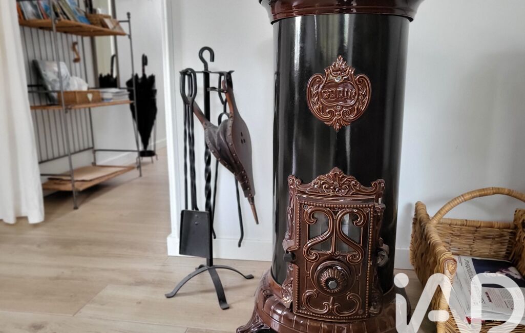 Le rez-de-chaussée s'ouvre sur une entrée menant à un séjour baigné de lumière naturelle, agrémenté d'un poêle Godin, véritable élément de caractère. La cuisine, entièrement équipée, s'intègre harmonieusement dans la continuité de l’espace de vie.