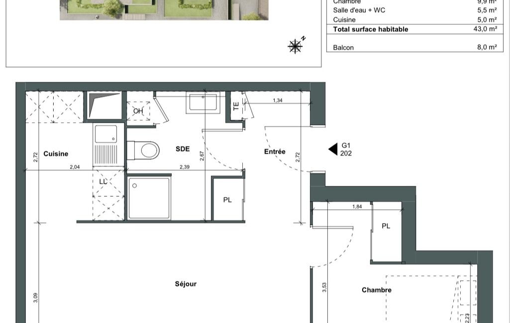 - Surface habitable : 43 m²
