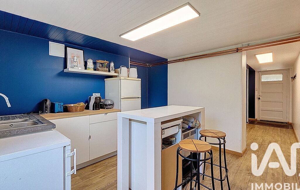 une pièce de vie lumineuse équipée d’un poêle à granulés, une cuisine semi-ouverte équipée, le tout donnant accès à une terrasse sans vis-à-vis. La hauteur sous plafond de 2,7m apporte un beau volume à la pièce.