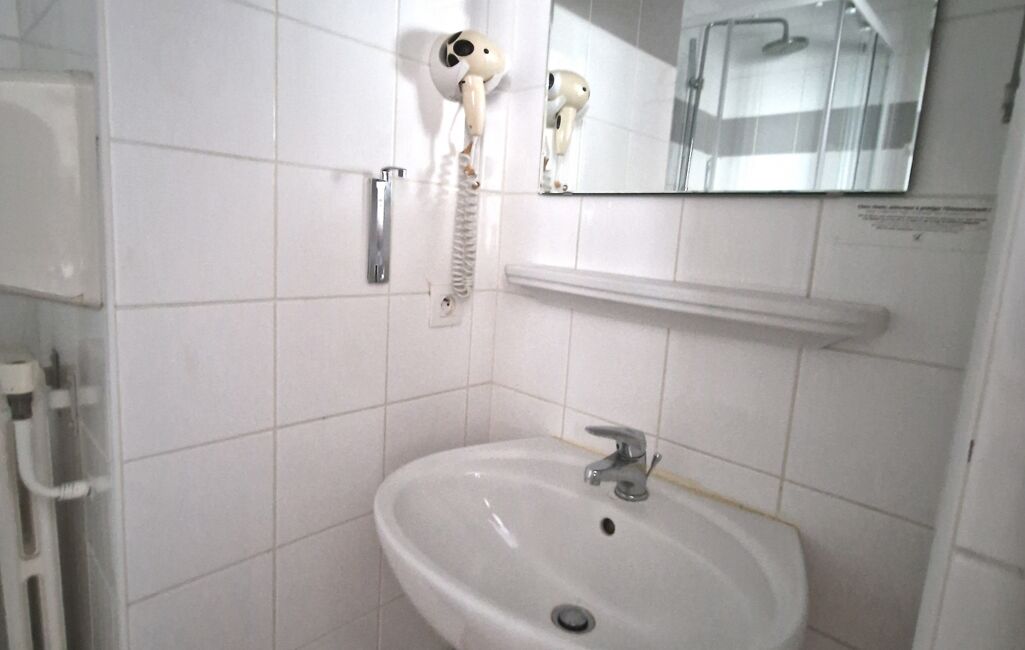 Ici, vous découvrez une des anciennes chambres d'hôtel, au 1er étage, qui représente un appartement type studio de 16m2, en surface au sol, composé d'une pièce de vie spacieuse avec poutres apparentes et plusieurs espaces de rangements. Une salle d'eau avec wc. L'installation d'une cuisine est à prévoir. Ainsi que les installations d'un tableau et de radiateurs électriques.