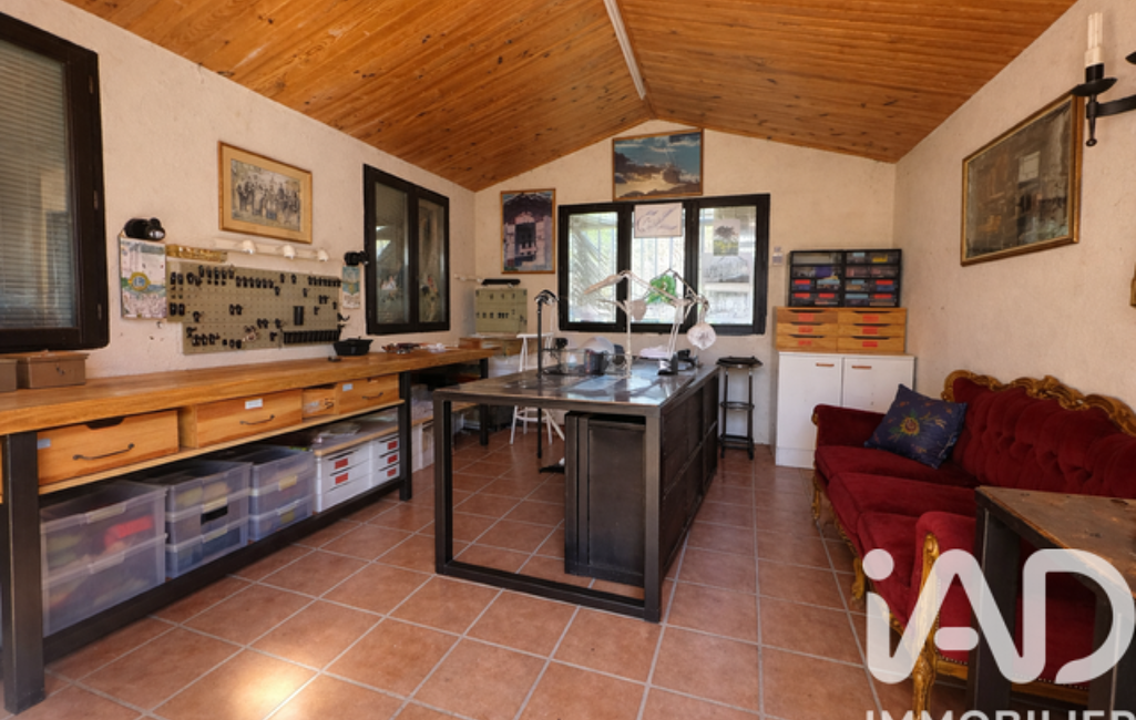Deux garages avec portes électriques, un atelier avec remise et un chalet en bois complètent la propriété.