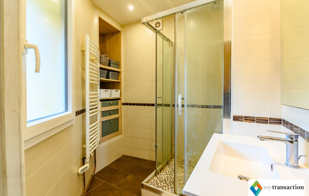 - À l'étage : Espace nuit spacieux avec une grande chambre et une salle d'eau optimisée (fenêtre, sèche-serviette et rangements).