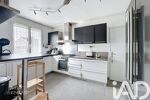 Au rez-de-chaussée, l’entrée cathédrale ouvre sur un double séjour lumineux avec poêle à bois et une cuisine équipée séparée, pouvant être ouverte sur le séjour.