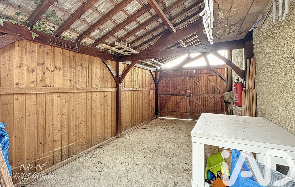 L’extérieur offre un jardin arboré avec terrasse exposée Est. La maison dispose également d’un garage et d’un porche pouvant accueillir plusieurs véhicules.