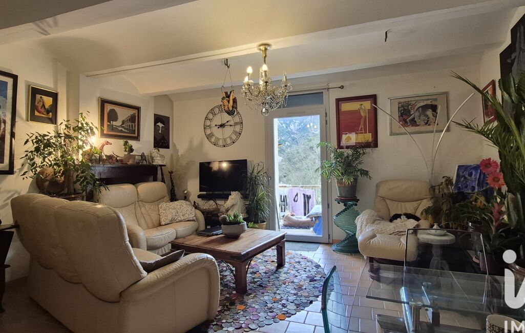 L'entrée par la cuisine dessert un espace de vie lumineux et un balcon surplombant la vallée et la rivière 'La Vis'.