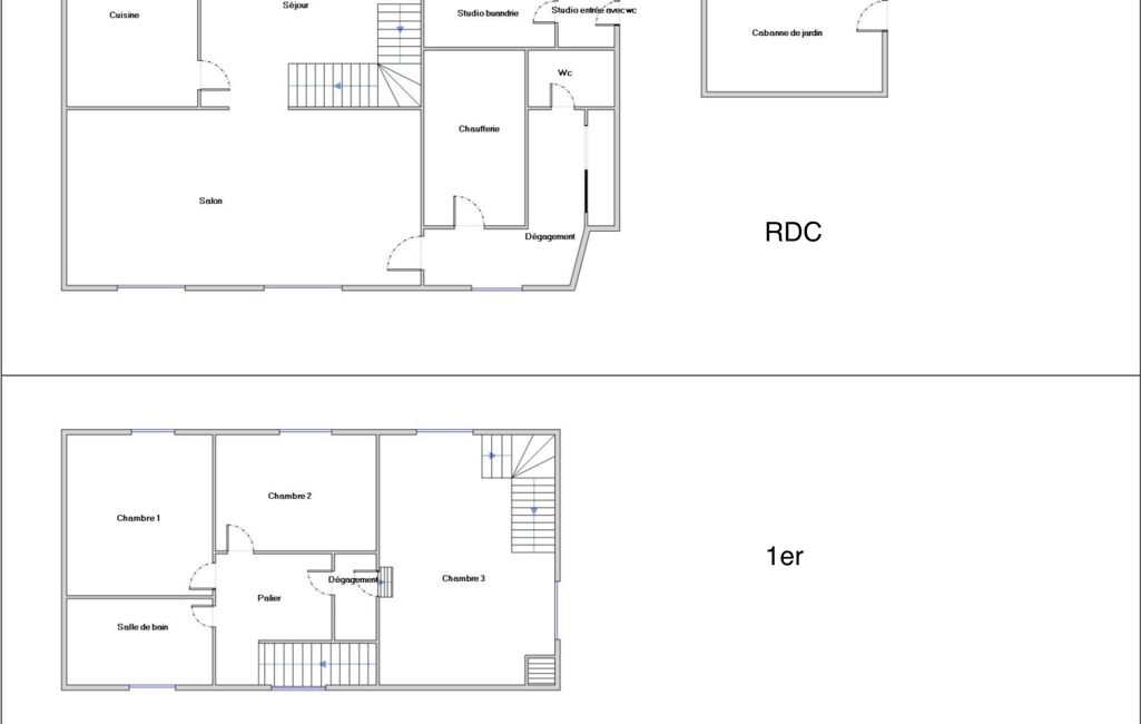 1ER : palier desservant 3 chambres, wc, salle de bain avec douche et baignoire