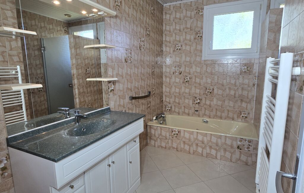 Une véranda chauffée permettant de profiter d’un espace lumineux toute l’année, une cuisine aménagée, un vaste salon-séjour, deux chambres, une salle de bains avec baignoire et douche, un WC indépendant ainsi qu’un grand placard de rangement.