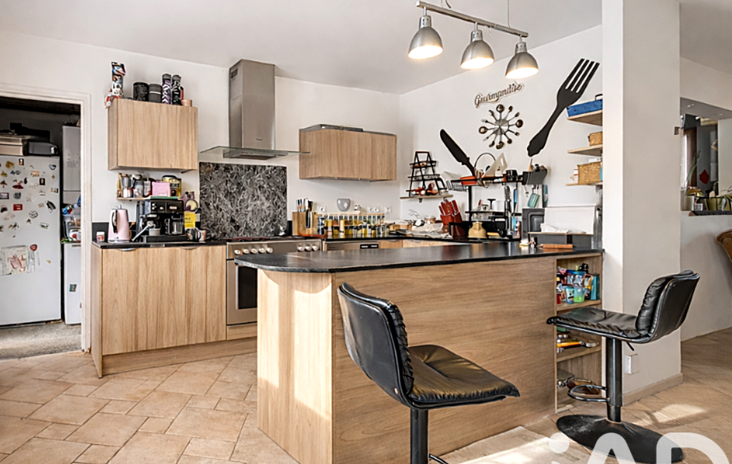 Espace de vie convivial : Un grand séjour/salon lumineux ouvert sur une cuisine aménagée et équipée.