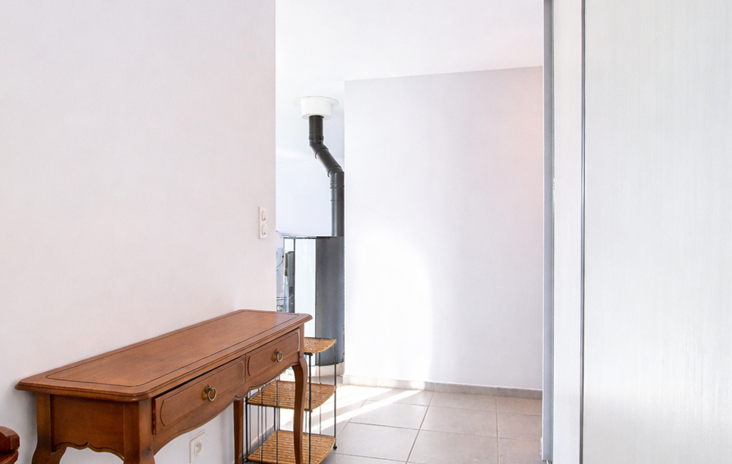 Dès l’entrée, vous profitez d’un espace avec de grands placards intégrés, idéal pour le rangement. La pièce de vie, véritable cOEur de la maison, propose environ 45 m² avec un séjour spacieux et une cuisine ouverte, entièrement meublée et équipée, agrémentée d’un îlot central convivial. L’ensemble est baigné de lumière grâce aux baies vitrées et offre un espace salon/salle à manger chaleureux, complété par un poêle à granulés.
