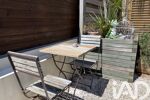 Derrière une façade discrète et une fois la porte franchie , vous découvrez, après quelques marches, le jardin il se déploie en longueur en deux parties,la première partie est réservée aux plantes et fleurs odorantes et herbes fraîches en poteries. La seconde accueille des persiennes avec ses jardinières, une partie salon à l’abri des regards.