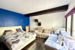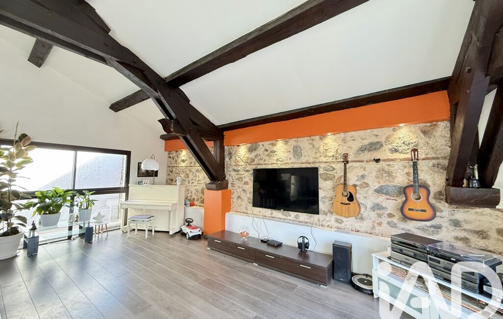 À l’étage, le bien révèle toute son identité loft avec un séjour de plus de 70 m², baigné de lumière grâce à ses larges ouvertures et sa hauteur sous plafond.