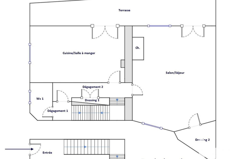 L'appartement est réparti sur deux niveaux avec son entrée indépendante, son compteur d'électricité indépendant et ses arrivées d'eau indépendantes.