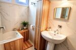 Une salle d’eau avec demi baignoire et vasque