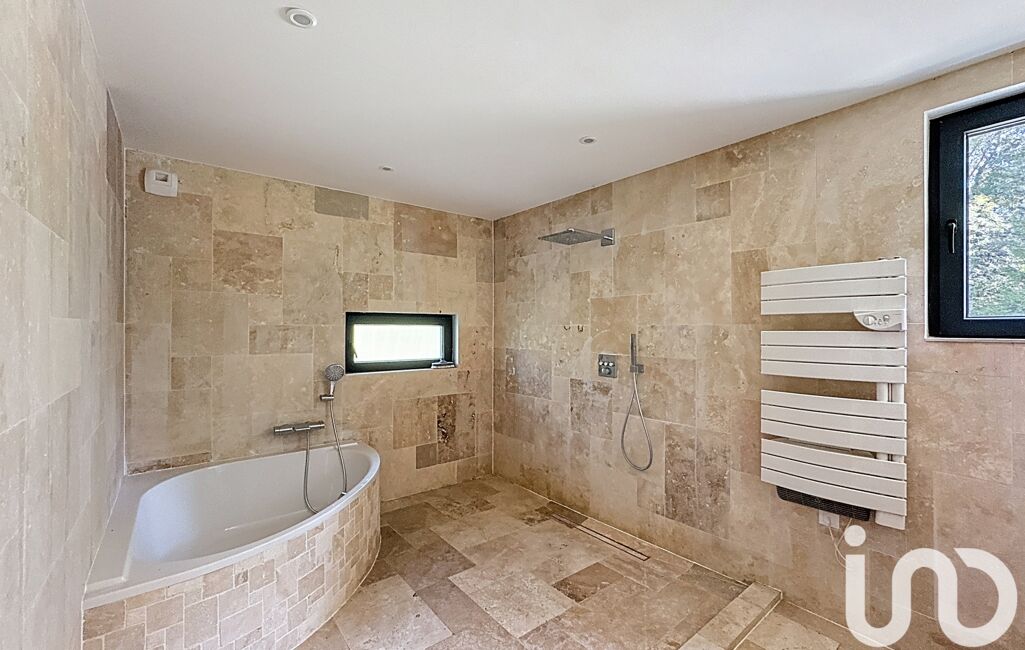 •Une spacieuse salle de bain avec double vasque, douche à l’italienne et baignoire,