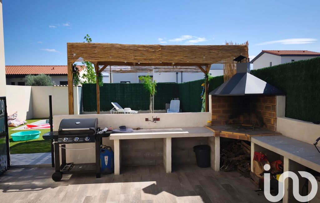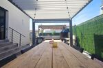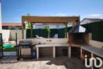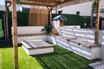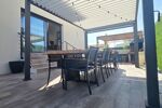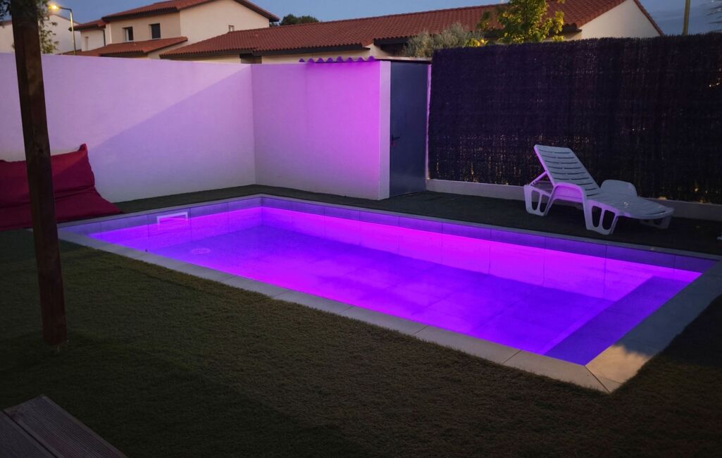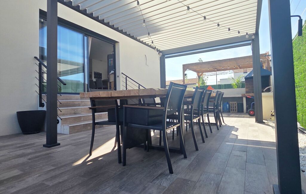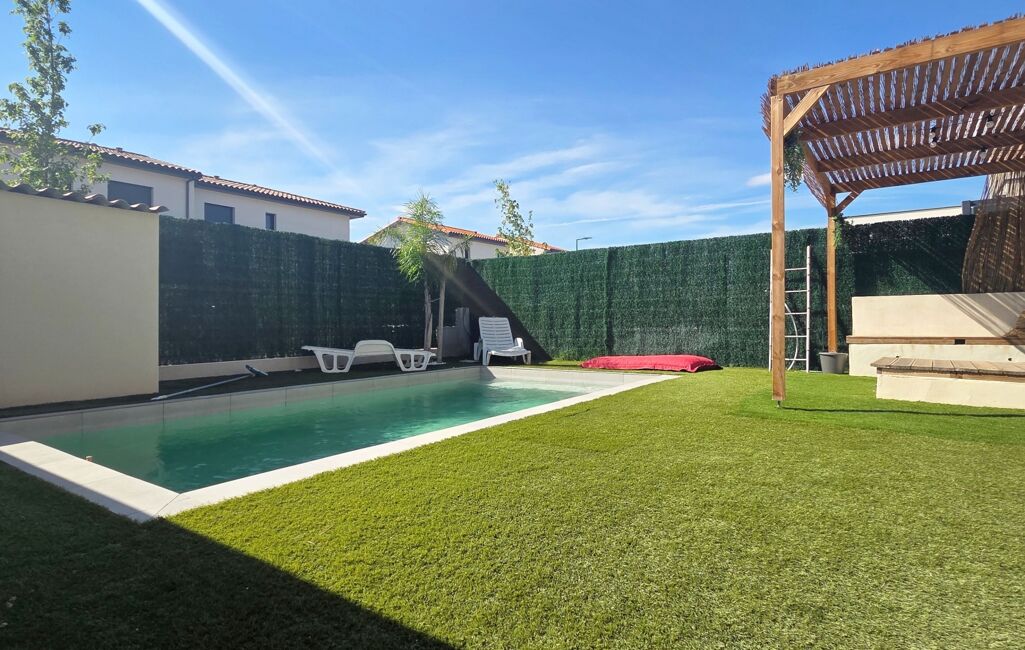 Pour la partie jardin, le jardin entièrement fini avec un peu de vis à vis avec piscine de 6 par 3, gazon synthétique avec coin salon de jardin avec brasero et une terrasse avec pergola bioclimatique et coin barbecue en dur.