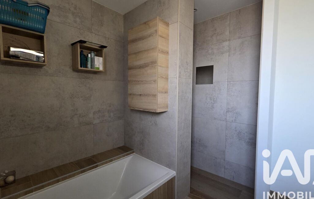 Elle comprend une spacieuse cuisine aménagée donnant sur un beau séjour cathédral, équipé d'un poêle à granulés. Le coin nuit se compose de trois chambres avec placards. La salle de bain est équipée d'une baignoire et d'une douche à l'italienne.