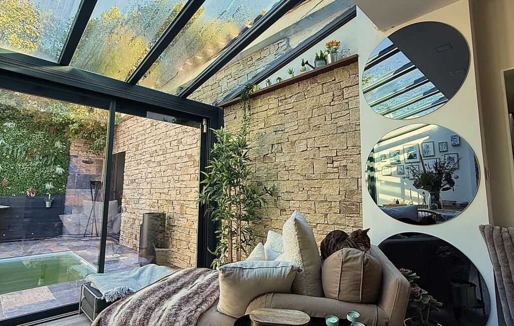 Dès l’entrée, la maison révèle une distribution fonctionnelle avec une buanderie facilitant le quotidien. La cuisine, entièrement équipée, s’intègre naturellement à l’espace de vie. Un premier salon baigné de lumière grâce à une toiture en verrière et de larges baies vitrées s’ouvre sur la piscine et crée une continuité dedans-dehors très agréable. Le séjour accueille un second salon, offrant un espace de réception chaleureux et modulable, complété par un toilette invité ainsi qu’un bureau.