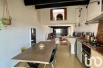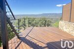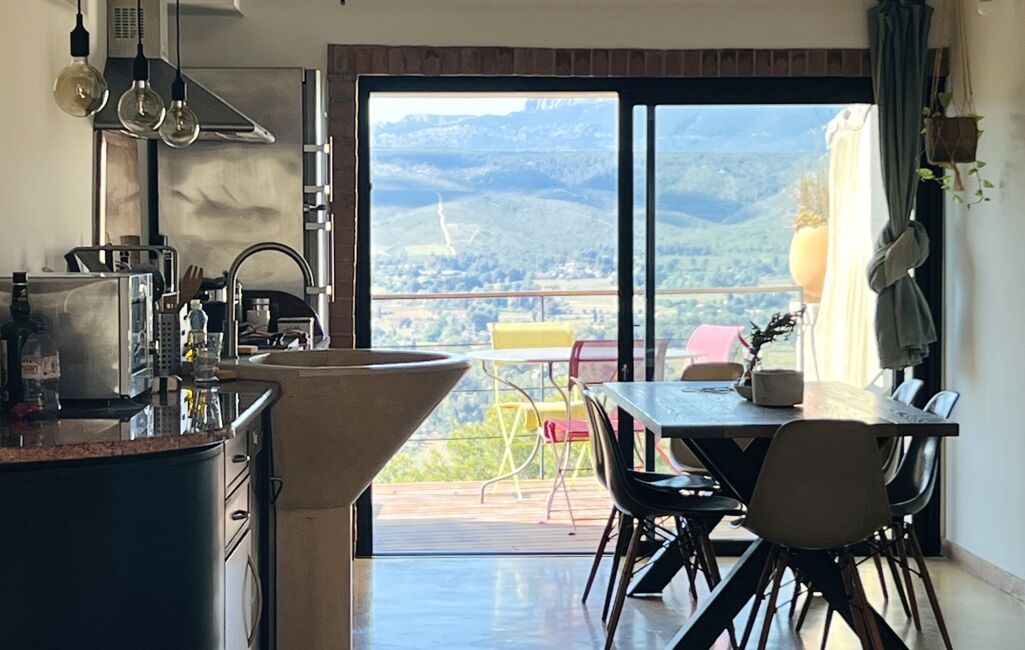 Cet espace 'lounge' est idéal pour vous détendre au coin du feu. Dans la continuité, le séjour/cuisine US donnent sur la terrasse en IPE pour vos déjeuners en été, ou vous pourrez profiter du 'tableau' provençal qui s'offre à vous : campagne, Ste Baume, mer au loin. Le coucher de soleil est exceptionnel !