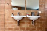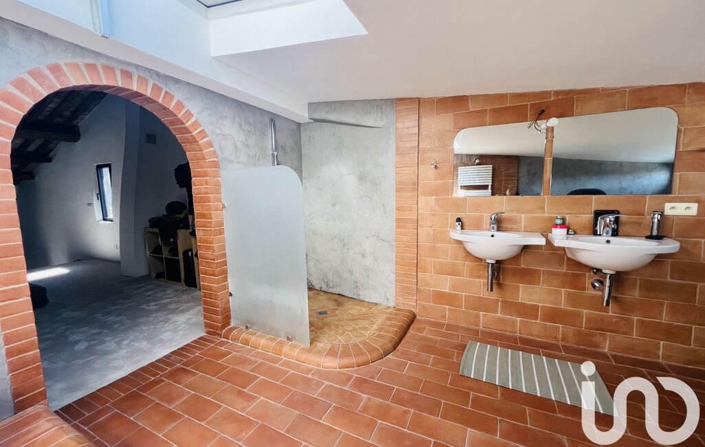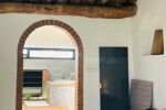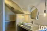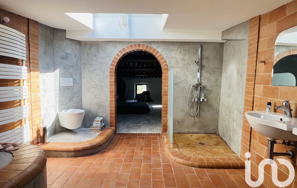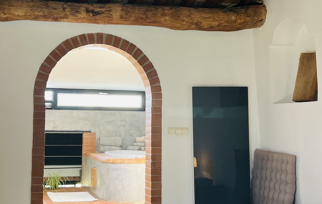 Sous l'arcade, la spacieuse salle de bains lumineuse comprend une baignoire entourée de terre de cuite et béton ciré, 1 douche, double vasque et wc suspendu.