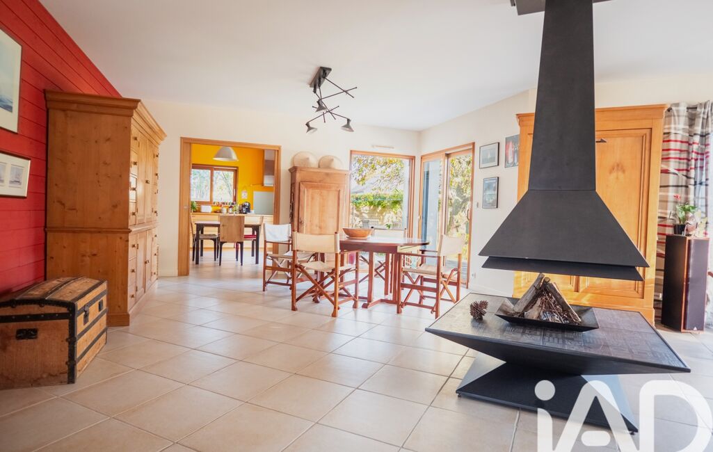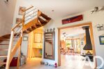 Une vaste entrée vous accueille et ouvre sur l'espace de vie de 60 m2 avec sa cheminée centrale, et qui ouvre directement sur la terrasse en bois et le jardin exposés sud. La cuisine attenante peut être ouverte ou fermée (galandage) au gré des envies, et l'ensemble offre une très belle luminosité.