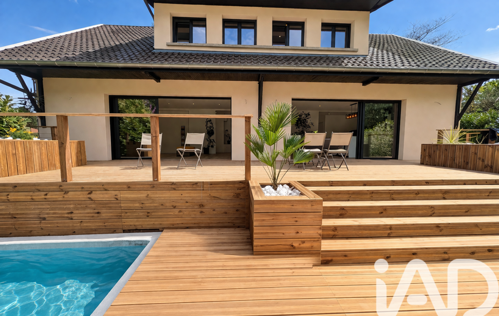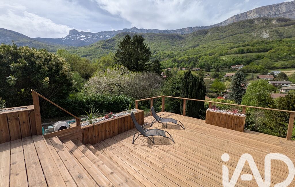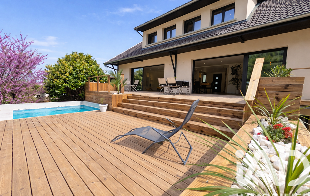 Dans le prolongement, la TERRASSE de 75 m² devient une véritable pièce de vie supplémentaire. On s’imagine aisément profiter des longues soirées d’été, recevoir ses proches, ou simplement savourer sans vis-à-vis, un moment de calme face à la piscine (7 x 3,5 m), avec en toile de fond, le Vercors. Ici, tout appelle à la détente.