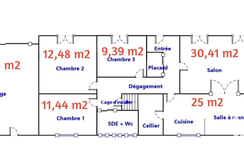 Cette maison dispose au RDC : Un hall d'entrée qui dessert, un salon- séjour de 30 m2 avec cheminée, une cuisine dînatoire de 25 m2, un cellier, 3 chambres de 9 m2, 12 m2 et 11 m2 ainsi qu'une salle d'eau de 7 m2 avec wc.
