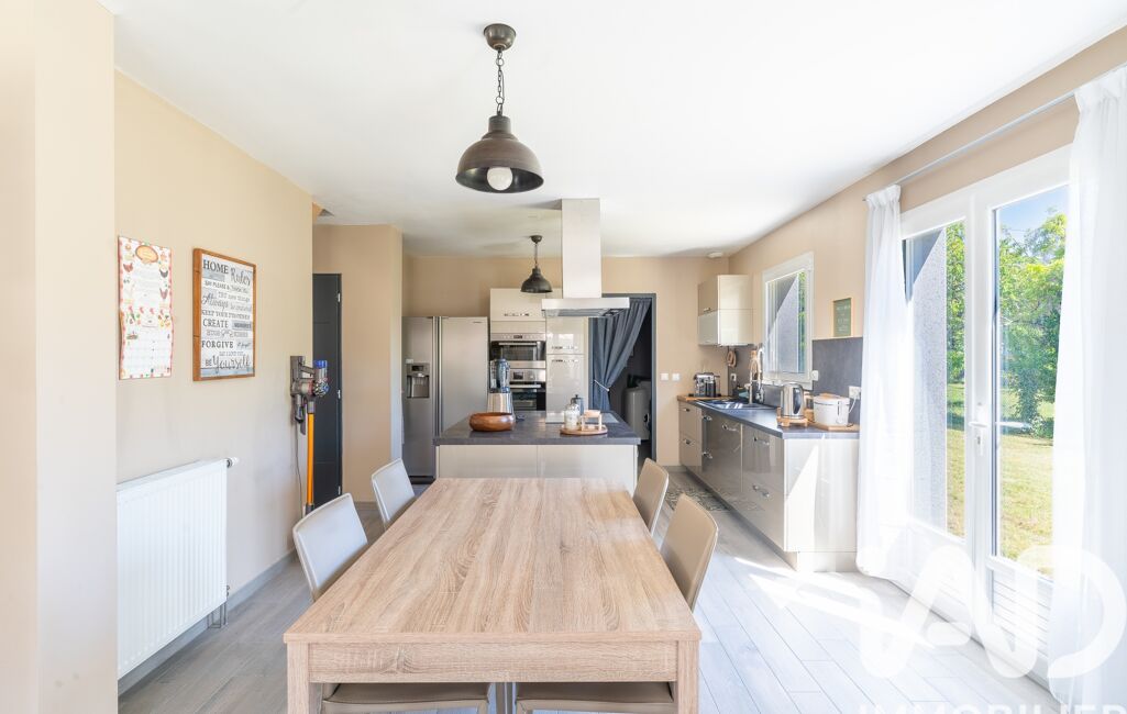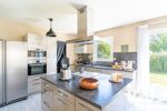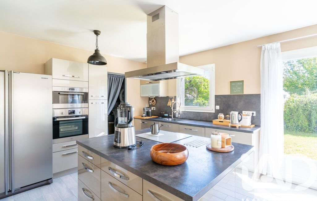 La cuisine, aménagée et équipée, est prolongée par un cellier fonctionnel et offre un accès direct à un grand garage double.