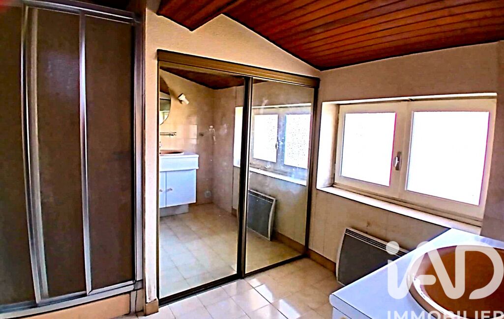 - 1 Salle d’eau de 6 m² avec douche cabine, 1 meuble vasque simple et miroir, 1 armoire penderie, étagères à portes coulissantes miroir, 1 placard de rangement étagères et penderie à portes coulissantes, sol carrelé, murs faïence et lambris, 1 fenêtre en bois en simple vitrage opaque