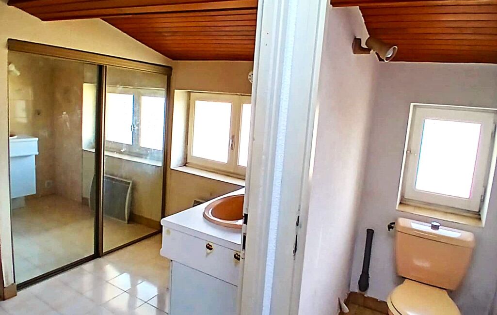 - 1 WC indépendant, sol carrelé et tapisserie, 1 petite fenêtre en bois en simple vitrage