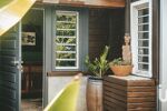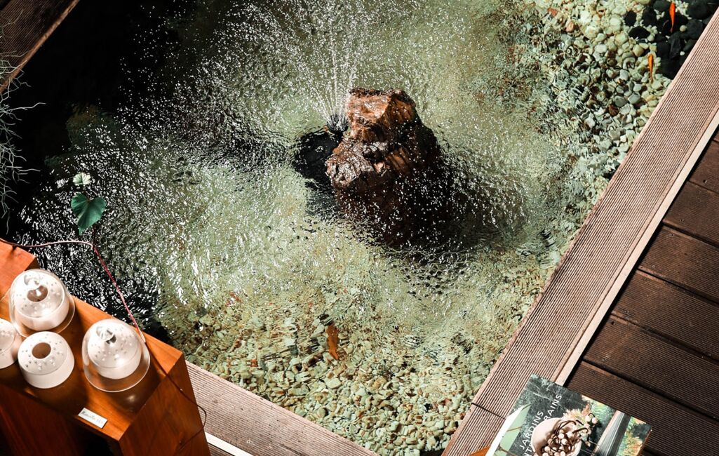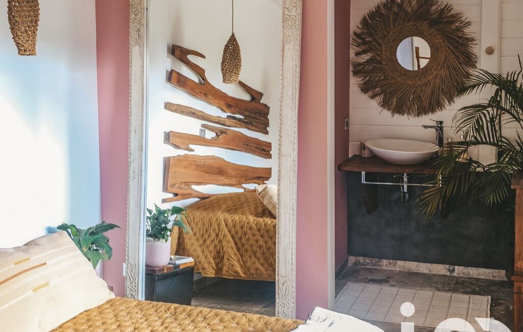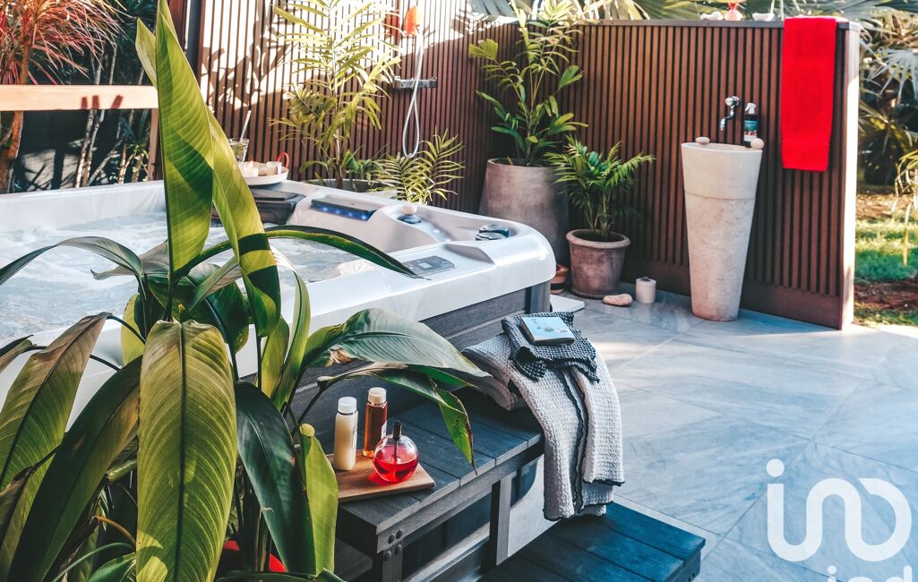 À l’extérieur, la magie opère : un jardin riche en essences tropicales, plantes medicinales et olfactives , une grande terrasse ainsi que deux terrasses secondaires pour les repas en plein air, une piscine protégee des regards, et 10 places de stationnement complètent l’ensemble.