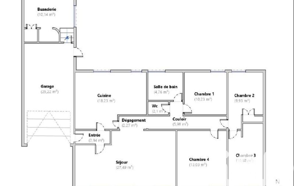 De plain-pied, la maison développe environ 107 m² habitables et offre une configuration idéale pour la vie de famille.