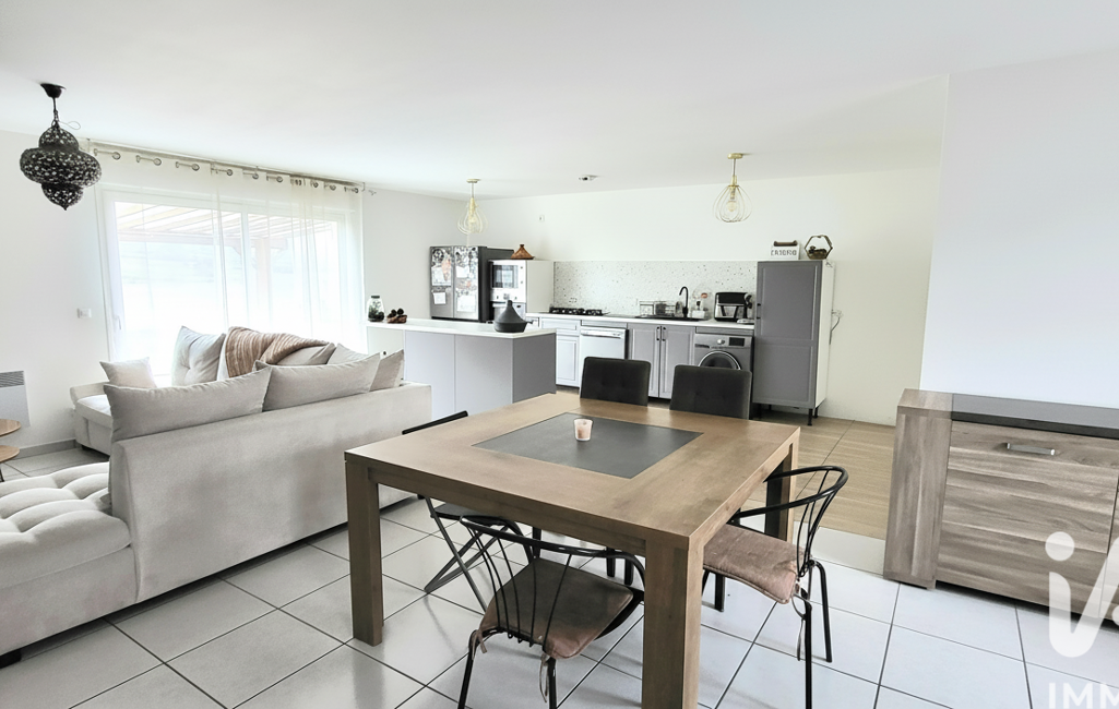Dès l’entrée, vous serez séduits par une vaste pièce de vie de plus de 50 m² offrant un espace convivial et lumineux, comprenant une cuisine ouverte, un salon chaleureux équipé d’un poêle à granulés et un espace salle à manger idéal pour recevoir famille et amis.