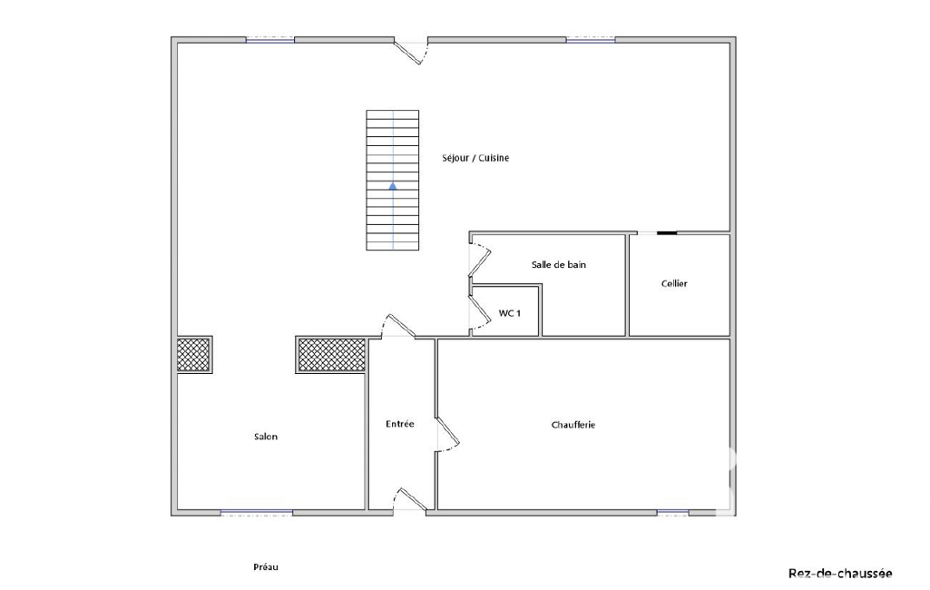 salon (11,5m²), un vaste séjour-cuisine aménagée et équipée (46m²), une salle de bain, wc, un cellier, une chaufferie (19,5m²).
