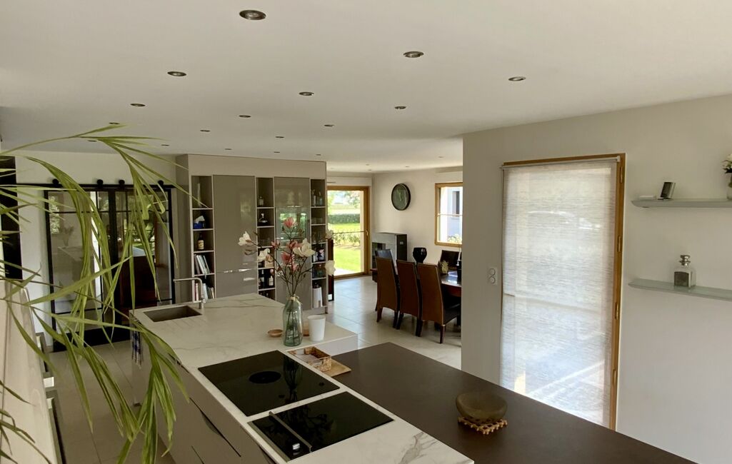 Vous trouverez au rez-de-chaussée, une entrée avec wc, un bureau avec terrasse et une lingerie. Un très bel espace de vie lumineux avec accès sur la terrasse exposée plein sud comprend une cuisine dînatoire ouverte, entièrement équipée ,moderne et fonctionnelle ,un véritable atout pour les amateurs de gastronomie , une salle à manger avec poêle à granules et un salon avec cheminée insert.