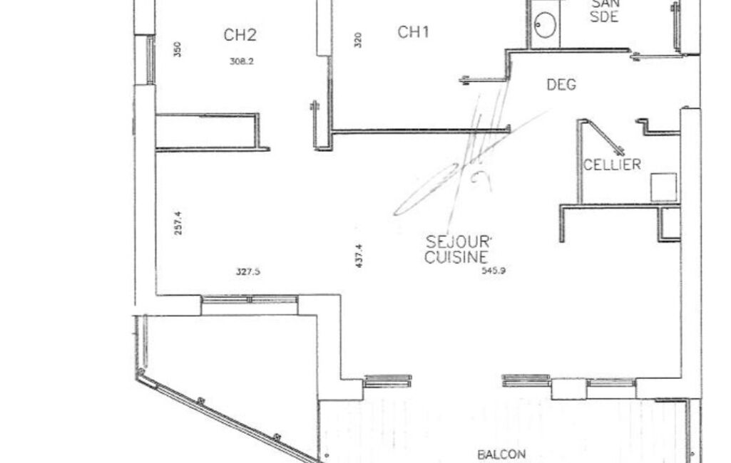 Séjour avec cuisine équipée, 2 chambres dont une avec placard, buanderie, salle d’eau avec WC.