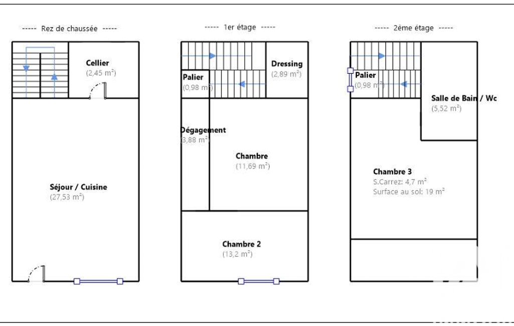 - 3 chambres, dont une sous combles (19 m² au sol)