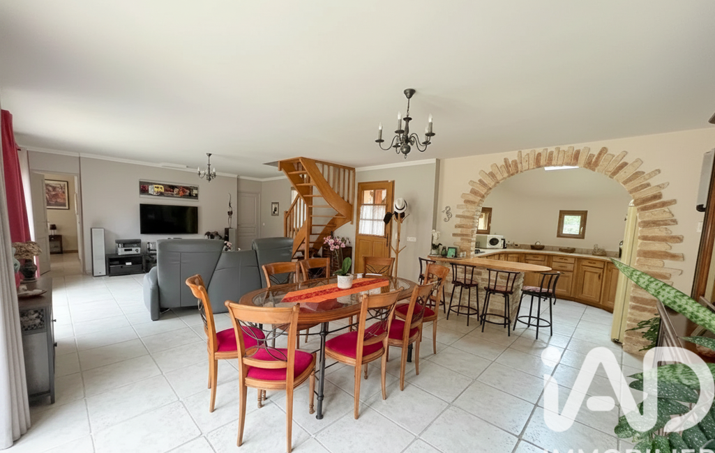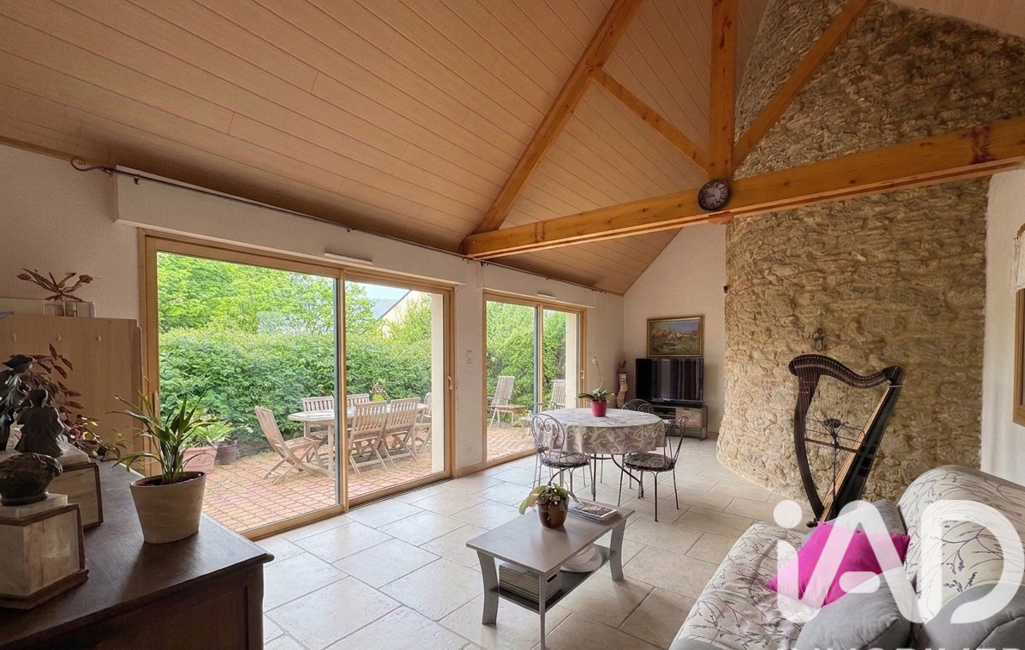 La maison principale, pensée pour une vie de plain-pied, propose une entrée ouvrant sur une belle pièce de vie lumineuse exposée sud, avec accès direct à la terrasse et au jardin. La cuisine aménagée et équipée, accompagnée de son arrière-cuisine, offre un espace fonctionnel au quotidien.