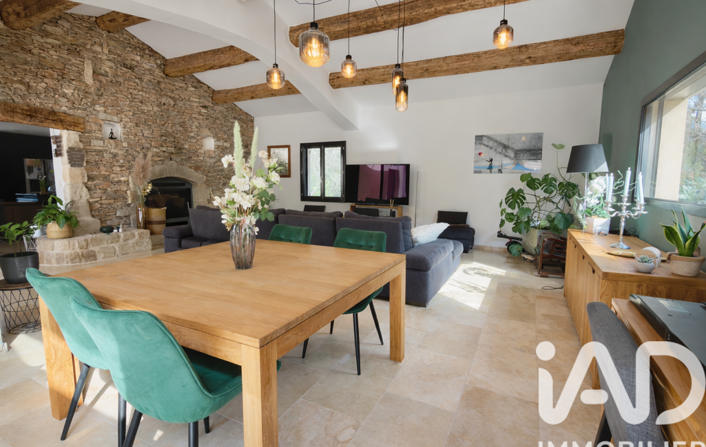 La pièce de vie, spacieuse et lumineuse, s'articule harmonieusement autour d’une cheminée à double insert traversant les espaces. Elle bénéficie de deux grandes baies vitrées qui prolongent naturellement l’intérieur vers une vaste terrasse ombragée, idéale pour les repas d’été.