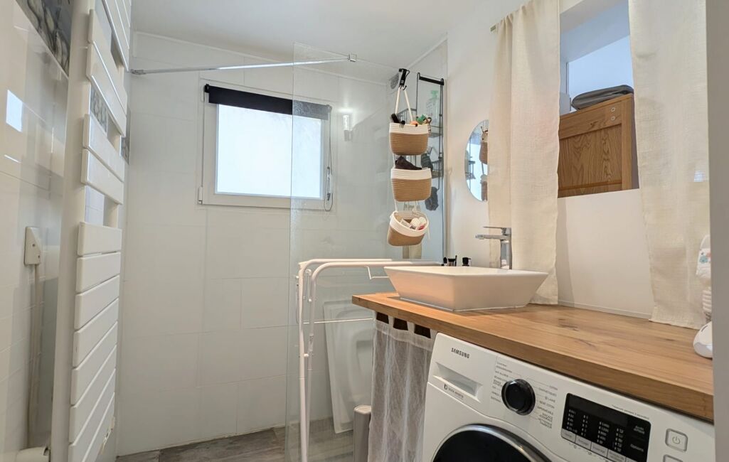Situé au 2ᵉ étage d’une résidence sécurisée avec ascenseur, le bien se compose d’une entrée desservant une salle d’eau et des WC indépendants. La cuisine équipée est ouverte sur le séjour, offrant un espace fonctionnel et lumineux grâce à sa double exposition.
