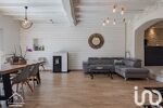 L’intérieur s’ouvre sur un vaste lieu de vie de 90 m², où cuisine, salle à manger et salon se rejoignent dans un esprit convivial et lumineux. Le poêle à granulés et le mur en pierres apparentes apportent une touche chaleureuse qui donne immédiatement le ton.