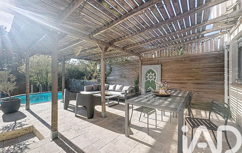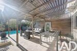 Le séjour s’ouvre sur une agréable terrasse en travertin, parfaitement aménagée, avec une piscine hors-sol, créant un véritable espace de détente à l’abri des regards.