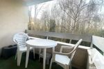 Le séjour s’ouvre sur un balcon en intérieur de résidence, avec une vue dégagée sur les arbres au calme.