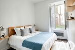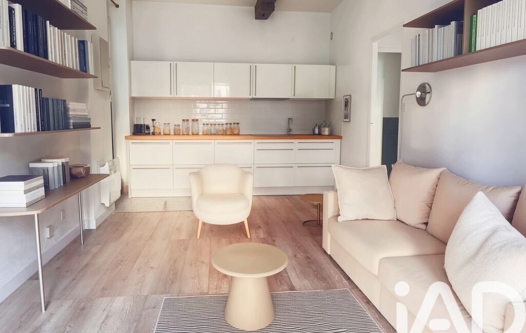 On entre directement dans le séjour ouvert sur sa cuisine. Un patio permet un gain en clarté et un accès extérieur original. L'appartement est entièrement tourné vers le jardin de la copropriété dans lequel on s'imagine profiter du chant des oiseaux aux beaux jours. Un palier distribue le WC, une salle de bains spacieuse accueillant le coin lingerie (ballon d'eau chaude) et une chambre séparée. Grâce à des hauteurs sous plafonds particulièrement haute, l'appartement semble particulièrement aéré.